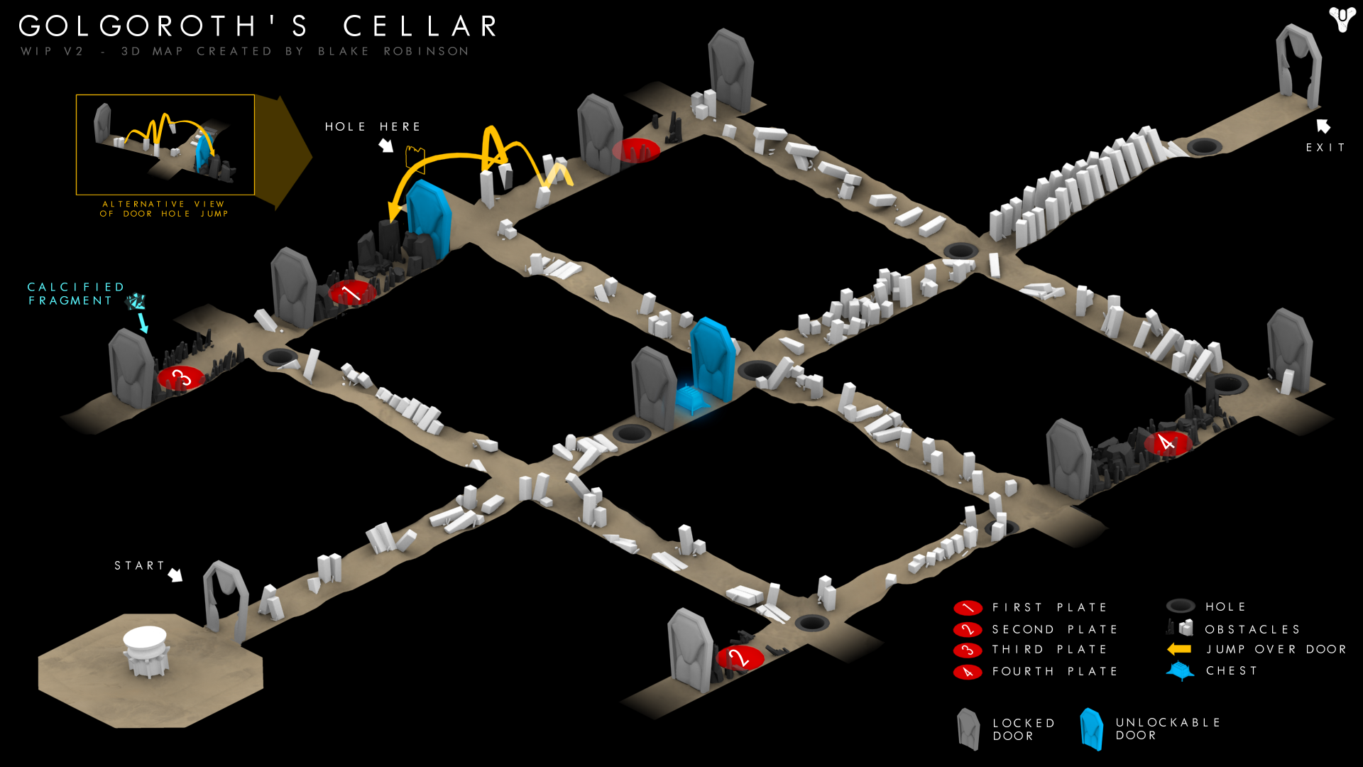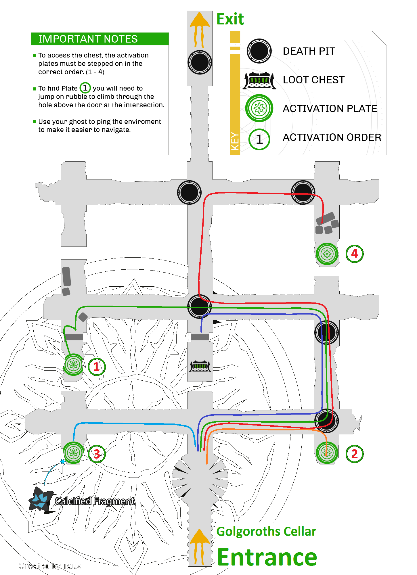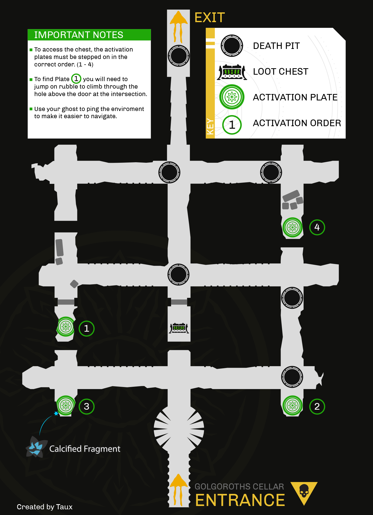If you're just muddling through here, the only thing you need to know is that all members of the fireteam must be present at the exit door in order for it to open. However, if you're hoping to scour the area for the hidden chest and Calcified Fragment, here's a description of the layout.